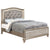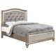 The Ameni Metallic Platinum Tufted Queen Bed is a stylish and functional piece of furniture that will make any room stand out. It features a fresh palette and romantic silhouette, and is made from high-quality materials that are sure to last. The bed includes a tufted headboard and bun feet, and has a glamorous platinum metallic finish. It is also tested for safety and stability, and is required to be assembled. The bed is made from Asian hardwood, pine wood, pine mahogany, white oak, and walnut veneer inlay. It has a camel back shape headboard and mirror that give it a stately elegance. The glamorous platinum metallic finish features a hand-applied highlight glaze, and the individually mounted mirror tiles create a glamorous Old Hollywood aura.