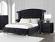 Indulge in the epitome of luxury and sophistication with the Dhabdhabewadi Black Velvet 2pc Bedroom Set with Queen Bed, a captivating ensemble that seamlessly blends functionality with captivating design. This exquisite set features a fully upholstered queen bed and matching nightstand, all adorned with sparkling facetted buttons in a special opalescent black finish. The bed is trimmed with hand-applied nailheads and rests on carved wood legs with a metallic silver finish. Black felt-lined top drawers provide safe storage for your jewelry or treasured keepsakes, while a removable jewelry tray in the nightstand offers additional organization. The platform bed is fully slatted, eliminating the need for a box spring.