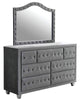 Indulge in the epitome of luxury and sophistication with the Dhabdhabewadi Grey Velvet 2pc Bedroom Set with Queen Bed, a captivating ensemble that seamlessly blends functionality with captivating design. This exquisite set features a fully upholstered queen bed and matching nightstand, all adorned with sparkling facetted buttons in a special opalescent grey finish. The bed is trimmed with hand-applied nailheads and rests on carved wood legs with a metallic silver finish. Grey felt-lined top drawers provide safe storage for your jewelry or treasured keepsakes, while a removable jewelry tray in the nightstand offers additional organization. The platform bed is fully slatted, eliminating the need for a box spring.