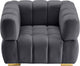 Indulge in the lap of luxury with the Gwen velvet chair, a perfect fusion of comfort and elegance. Sink into the plush navy velvet upholstery that wraps around this stylish chair, offering a touch of opulence to any space. With its generously padded design, the Gwen chair invites you to relax and unwind. The deep biscuit tufting not only adds dimension, but also enhances the oversized look of the chair while ensuring that the fill stays in place. Offering customization options, this chair comes with two sets of legs in either gold or chrome, allowing you to create a personalized touch of sophistication in your home. Upgrade your living room or reading nook with the Gwen velvet chair and experience the ultimate blend of comfort and style.