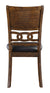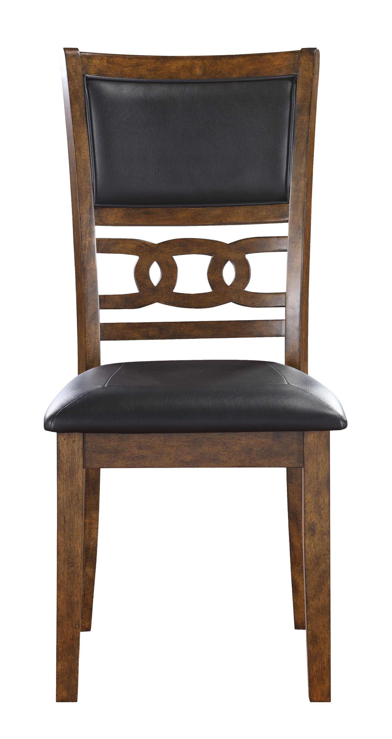 Upgrade your dining experience with the New Classic Wood Dining Chairs. Crafted from durable Rubberwood and Mindi veneers, these chairs offer both a sturdy structure and an appealing design. The rich brown finish, achieved through a meticulous multistep process and clear coat, enhances the natural beauty of the wood grain. Upholstered in black PU, the cushions and backs provide utmost comfort while adding a touch of sophistication. The transitional style of these chairs, featuring interlocking chain chair back detail, tapered legs, and clean lines, effortlessly complements any dining room decor. Assembly is a breeze with the included hardware and clear instructions. Backed by a one-year warranty, these dining chairs are a smart investment in both quality and style. Elevate your dining space with the timeless elegance of the Gia Wood Dining Chairs.