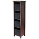 Introducing our versatile storage shelf that is sure to bring both style and functionality to your living space. With its warm Walnut finish and sleek design, this shelf is the perfect addition to any room in your home. It comes with four foldable black fabric baskets, allowing for easy organization and storage of your belongings. Whether you need a bookcase or extra shelf space, this storage unit has got you covered. Please note that assembly is required for the shelf, ensuring a secure and long-lasting addition to your home. Upgrade your storage solutions today with this exquisite storage shelf.