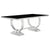 Introducing our stunning dining table, a true gem for those with a taste for contemporary style. The black finished rectangular top, accentuated with sleek silver edges, immediately catches the eye and adds a touch of modern sophistication to any space. The innovative circular design of the silver legs, resting on two beautifully crafted tiered bases, further elevates the overall aesthetic appeal. This lustrous table, when paired with a set of well-made chairs, creates a brilliant centerpiece that effortlessly commands attention in any dining room. Crafted to withstand the test of time, this modern yet timeless design promises years of everyday use without compromising on style. Elevate your dining experience with this one-of-a-kind piece that will undoubtedly impress both guests and family alike.